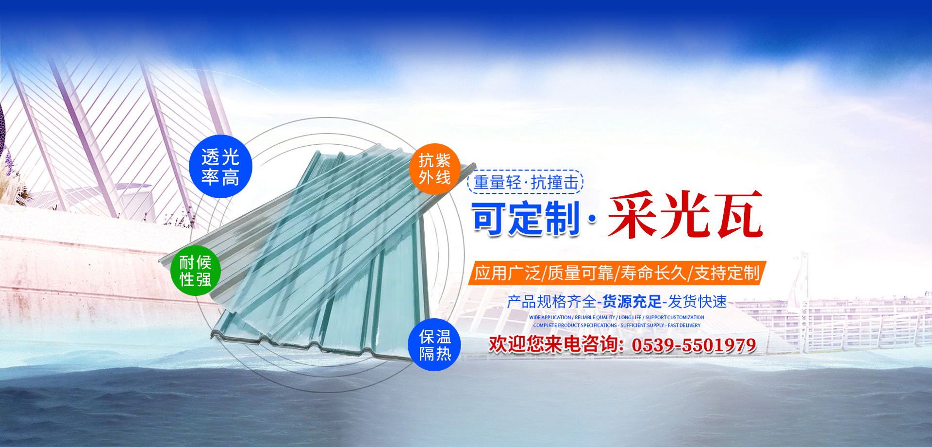 • 輕質(zhì)高強采光瓦便于搬運、安裝,其抗沖擊強度可達玻璃的200倍以上
